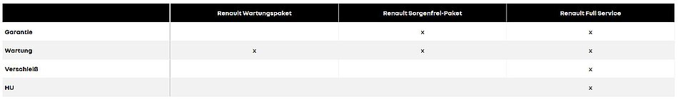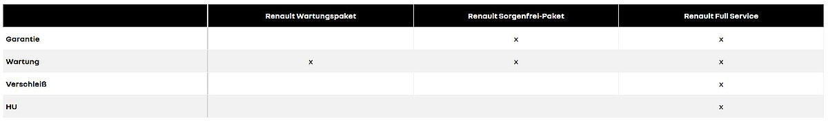 Mit dem Renault Full-Service-Paket entscheiden Sie sich für maximale Sicherheit und Komfort. Neben allen Wartungsarbeiten nach Herstellervorgaben sind auch Verschleißteile, die Hauptuntersuchung (HU) sowie eine Garantieverlängerung enthalten.